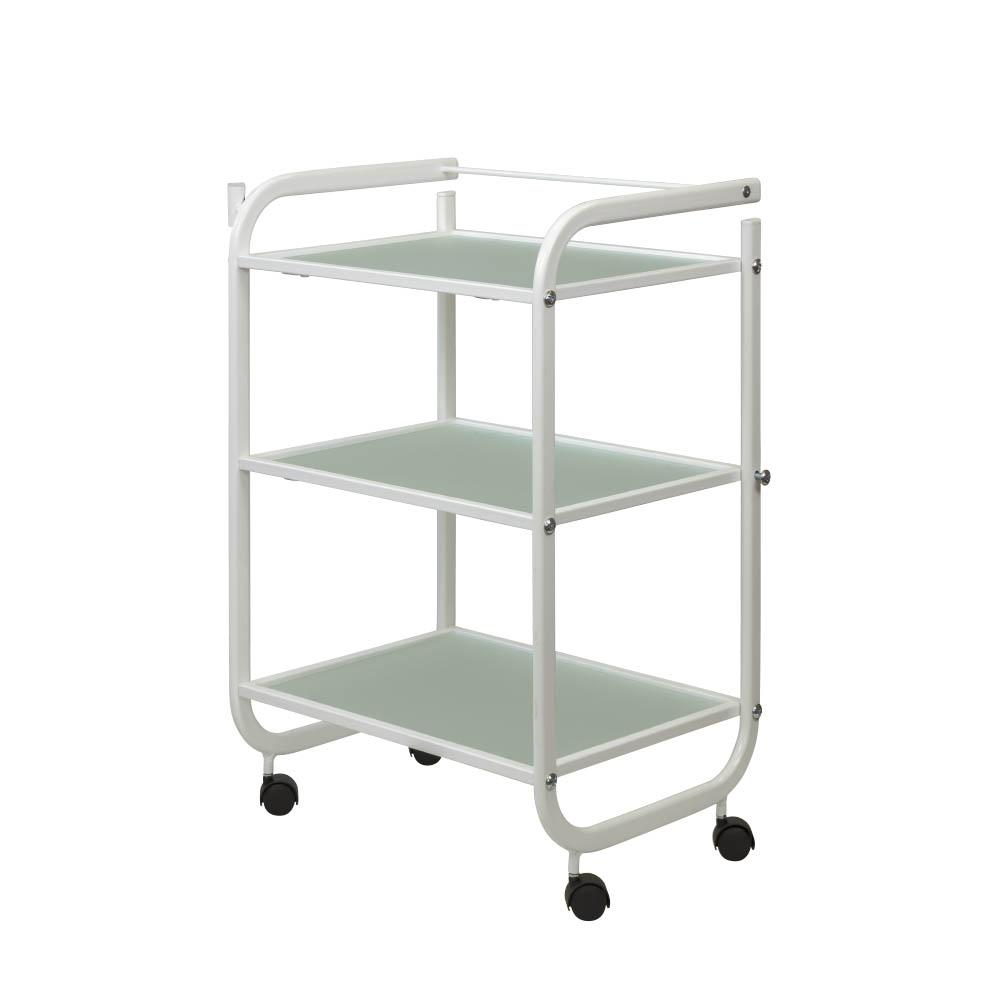 Комплектация: металлический каркас, три стеклянные полки с бортиками, колеса.