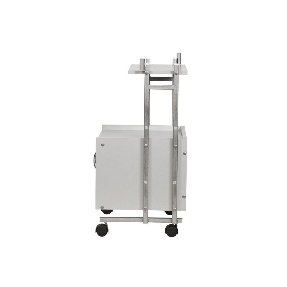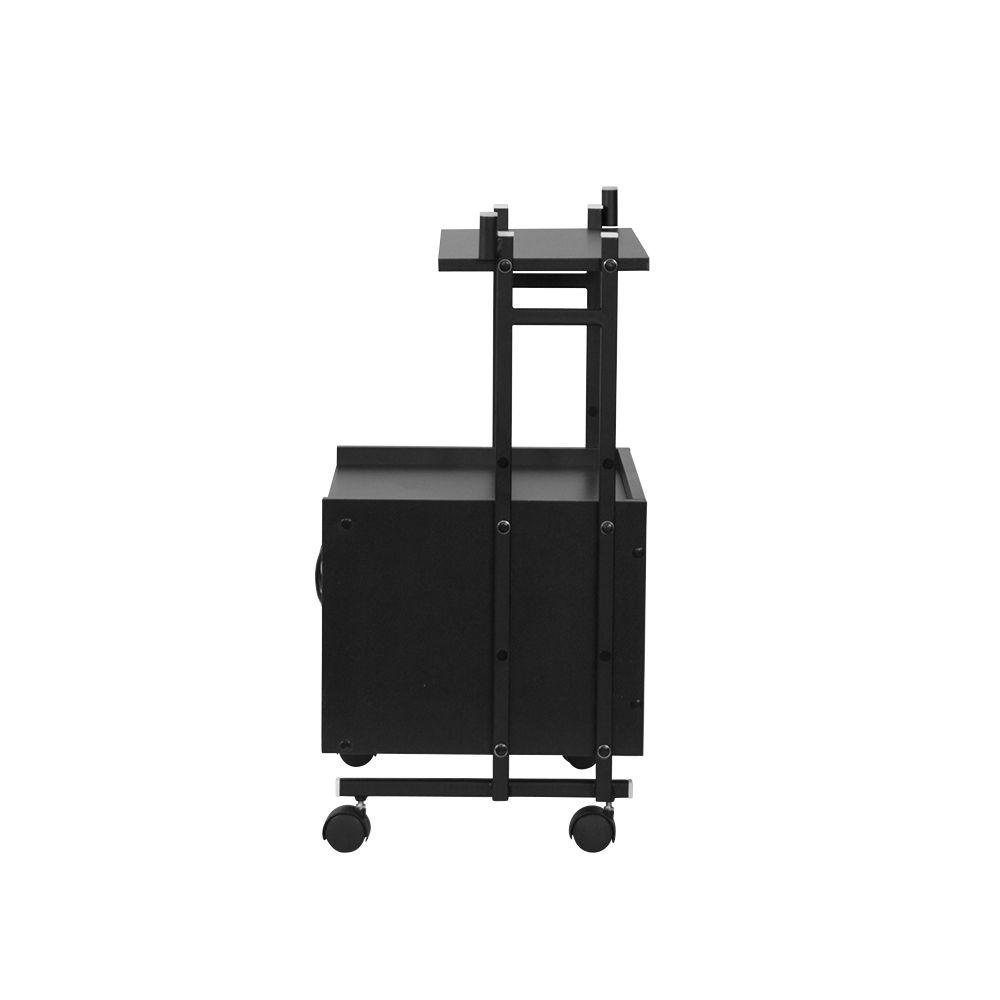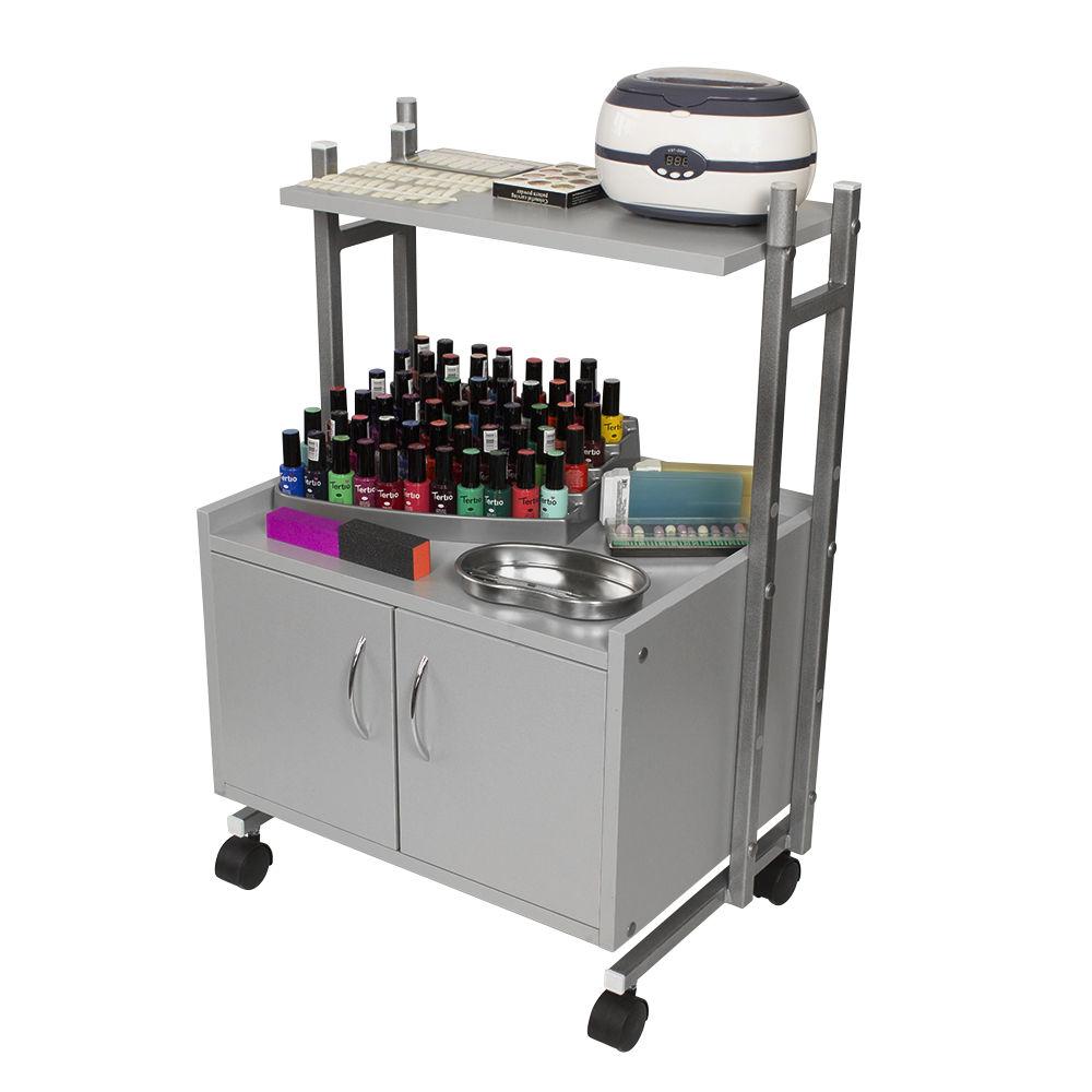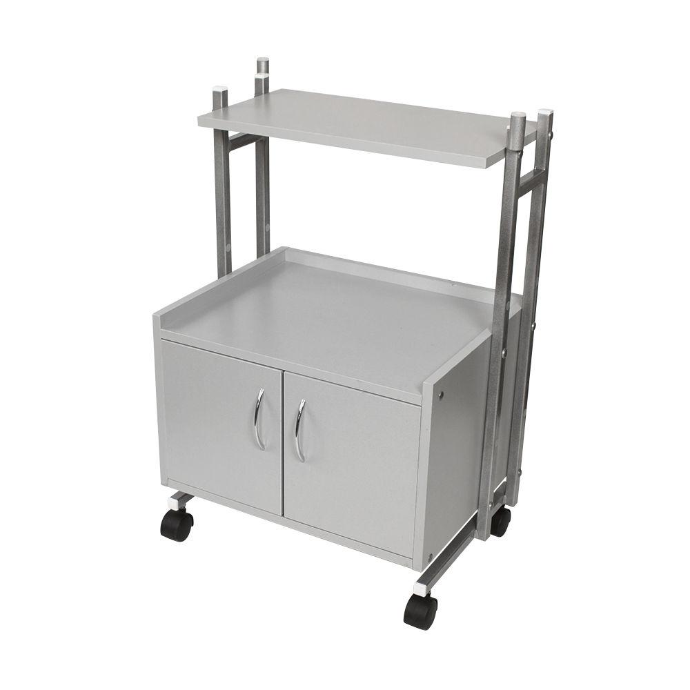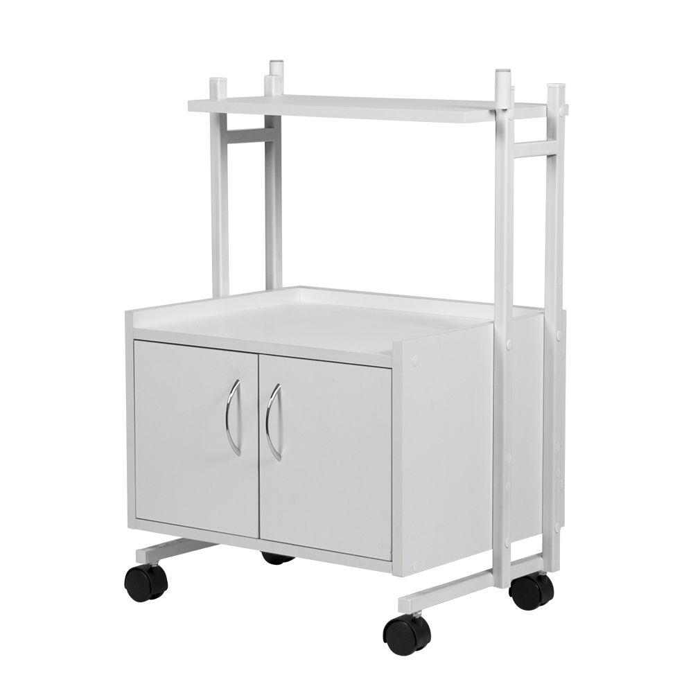 Каркас тележки – прочная сталь, покрытая белой порошковой краской с антикоррозийными свойствами. Основа установлена на вращающиеся колеса, благодаря которым тележку легко перемещать по рабочей площади. На верхней полке косметологического оборудования мастер может разложить инструменты и материалы, использующиеся во время процедур. Полочка и шкафчик изготовлены из ламинированной ДСП. Уход за оборудованием прост, потому как покрытие обладает влагостойкими свойствами и выдерживает моющие и дезинфицирующие средства. Удобная тумбочка разделена на два вместительных отделения, где мастер может в полном порядке хранить инструменты и расходные материалы. Между тумбой и верхней полкой имеется ещё одно практичное пространство. Полочка может вместить высокие бутылочки и небольшие косметологические аппараты. К основанию тележки прикреплены два функциональных держателя для лампы-лупы. Стойкая конструкция тележки выдержит большие нагрузки, не будет деформироваться. Косметологическая тележка окрашена в белый цвет, за счёт чего впишется в интерьер с любым дизайнерским решением. Небольшие размеры позволяют использование тележки даже в салонах с небольшой площадью. Косметологическая тележка МД-108 поможет мастерам упорядочить приспособления и организовать эффективный рабочий процесс.