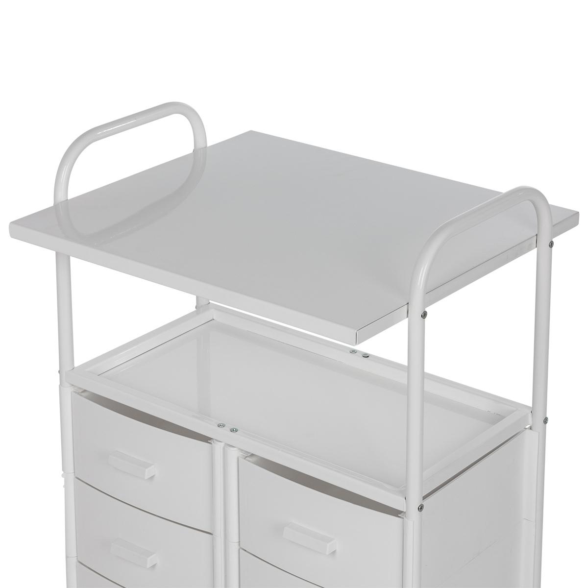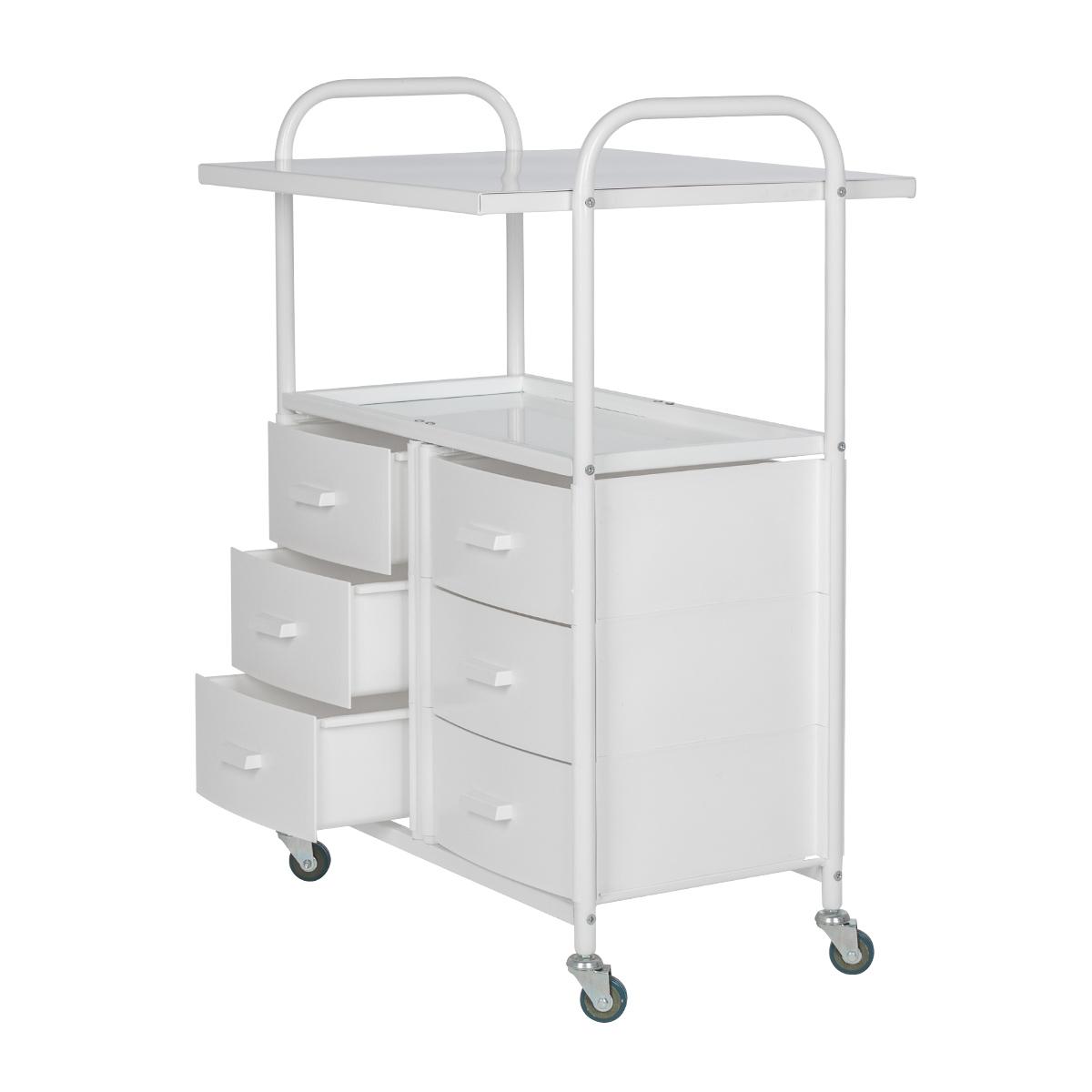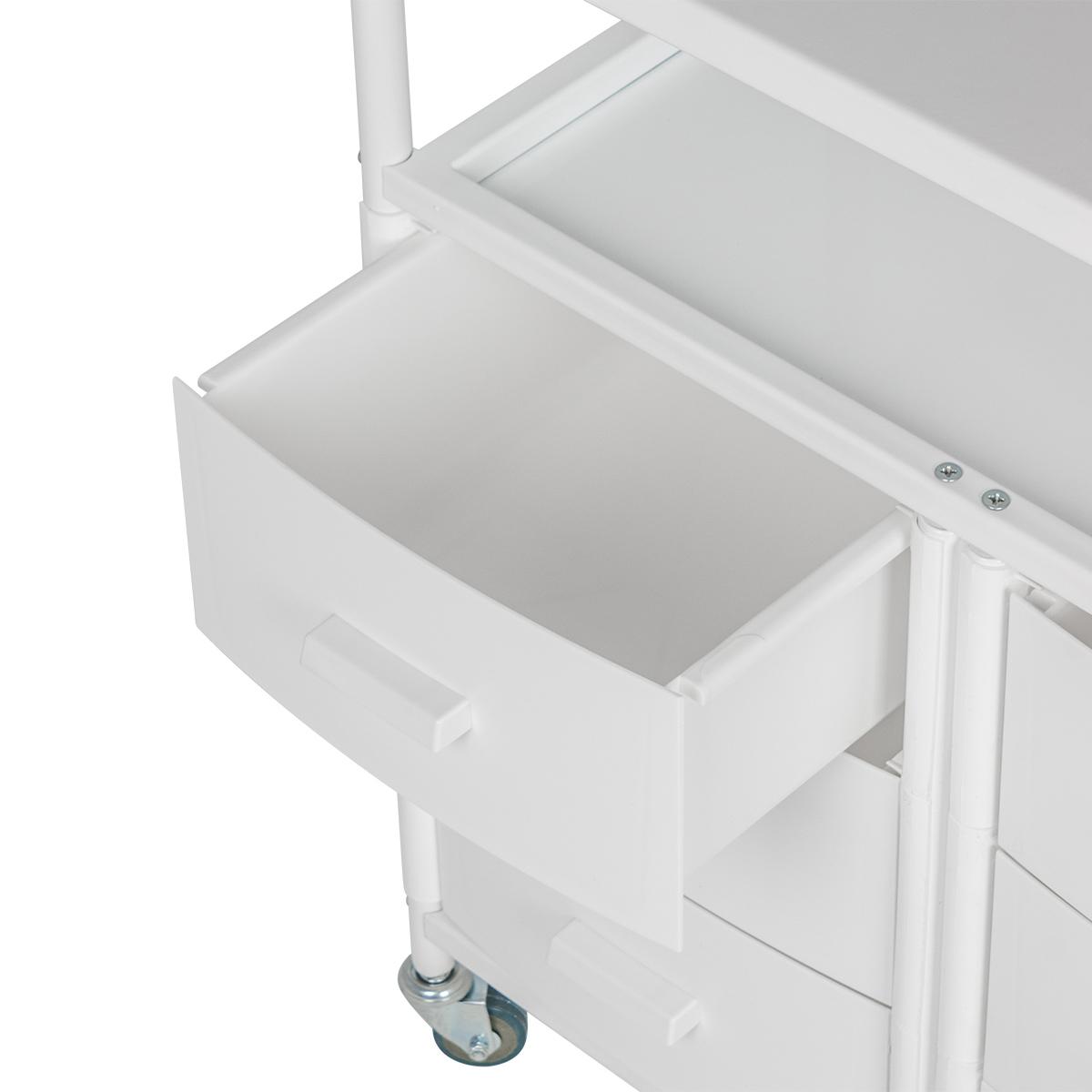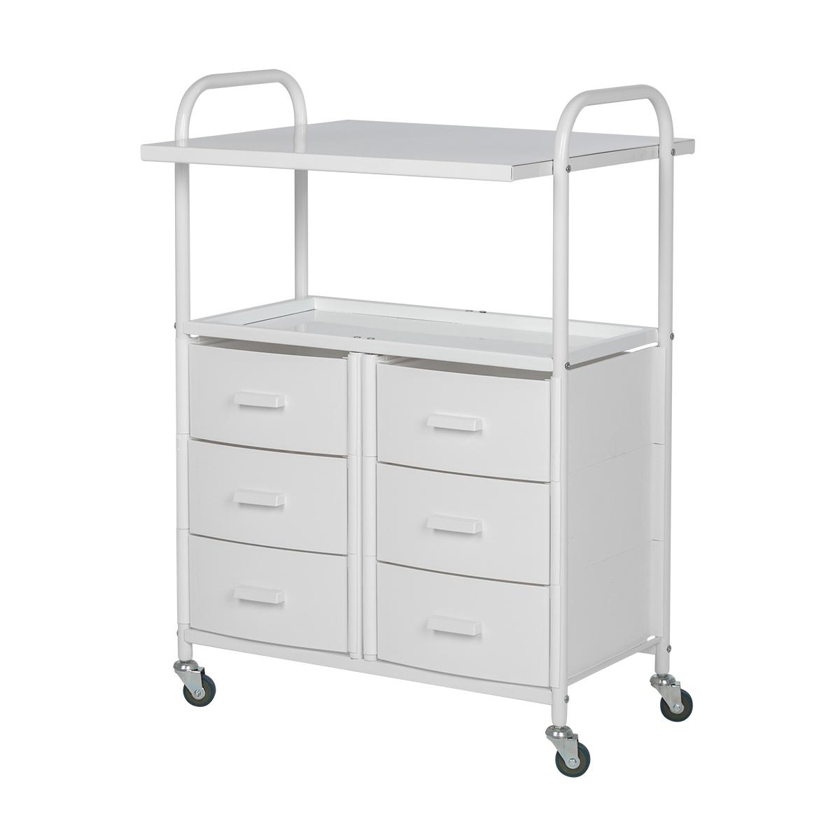 Косметологическая тумба-стеллаж Oliva Lazer – упростит работу специалистов и станет стильным дополнением в салоне красоты. Косметологическое оборудование не займет много места и гармонично дополнит интерьер салона красоты. Для инструментов, аксессуаров и расходных материалов достаточно места в шести выдвижных ящиках. Полки можно использовать как для необходимых приспособлений, так и для установки небольших аппаратов. Несомненным плюсом косметологического оборудования являются встроенные маневренные колесики. Мастер без особых усилий может перемещать косметологическую тележку по рабочей зоне. Каркас выполнен из прочного металла, поэтому косметологическая тележка выдержит на себе огромную загруженность инструментами и разными приспособлениями. Боковые панели и ящики изготовлены из ударопрочного пластика. Для полок использованы цельные металлические листы. Для защиты от коррозии и влаги поверхности металла защищены специальной краской. Материал прекрасно переносит чистку моющими и дезинфицирующими средствами. Компактная и вместительная косметологическая тумба-стеллаж Oliva Lazer эффективно решит проблему экономии рабочего пространства.