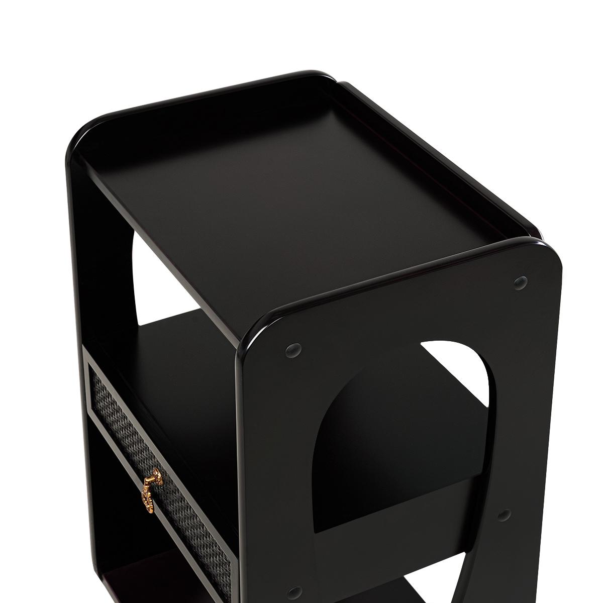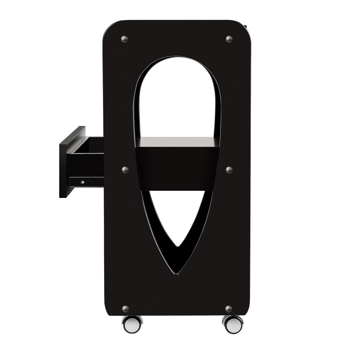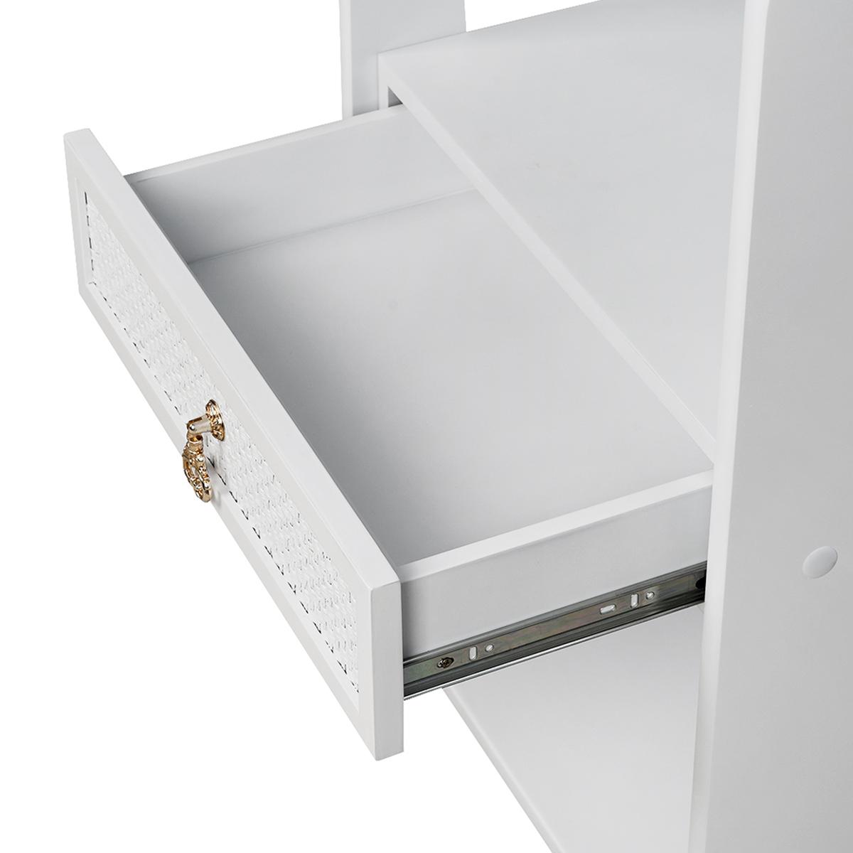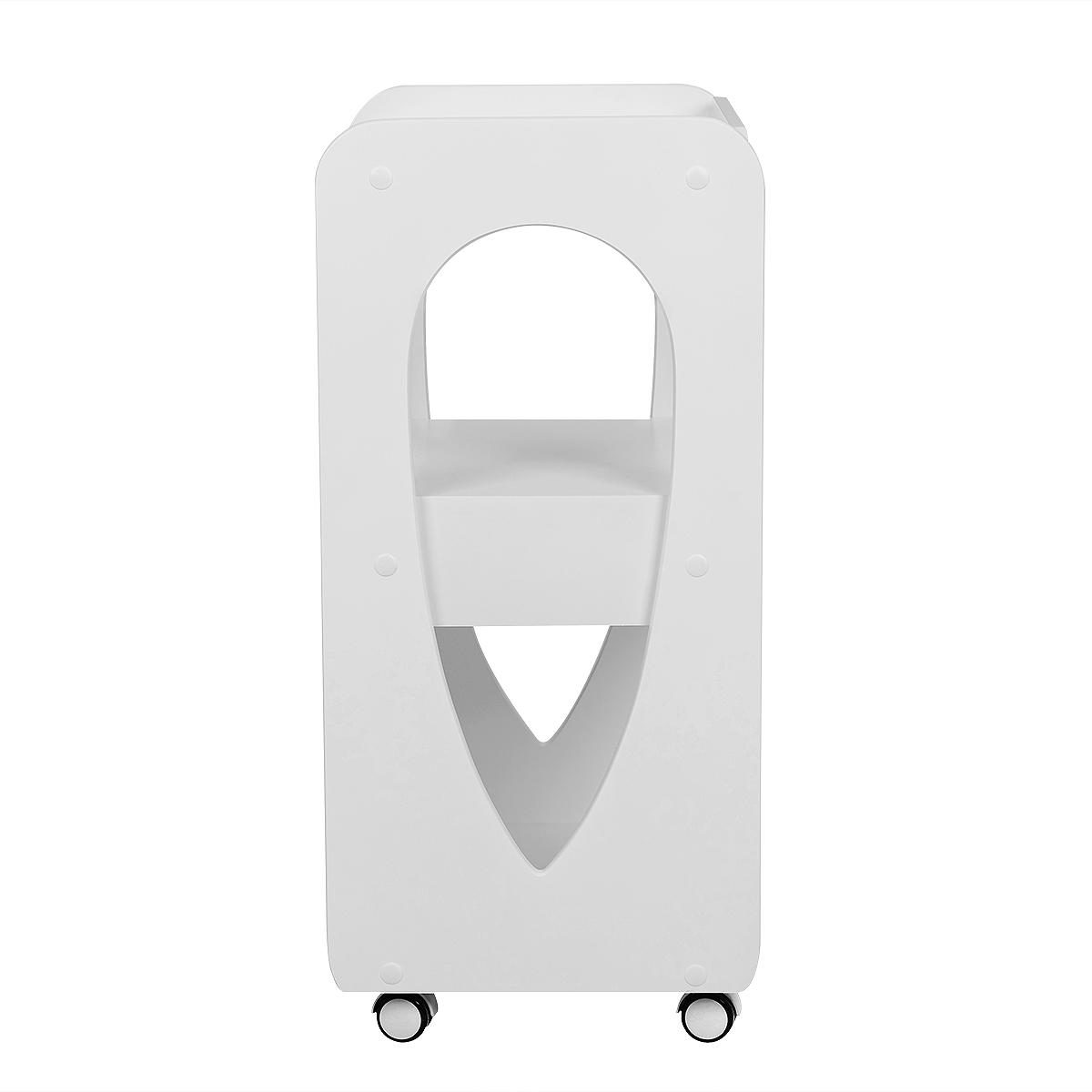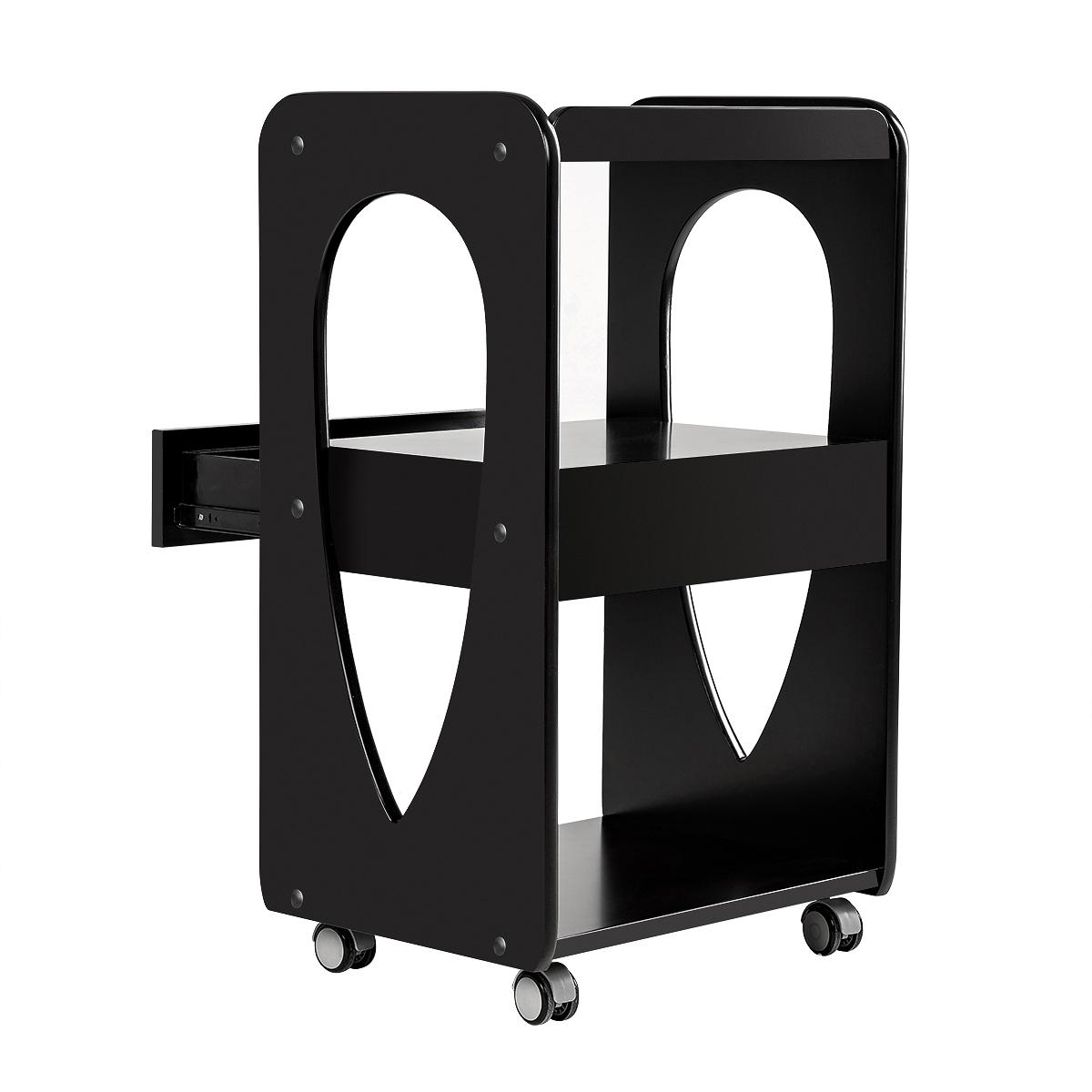 Комплектация: 1 выдвижной ящик с декорированной накладкой и 3 открытые полки; верхняя полка с бортиками; материал – дерево; 2 цвета; 4 опорных колеса, двойные, съемные.