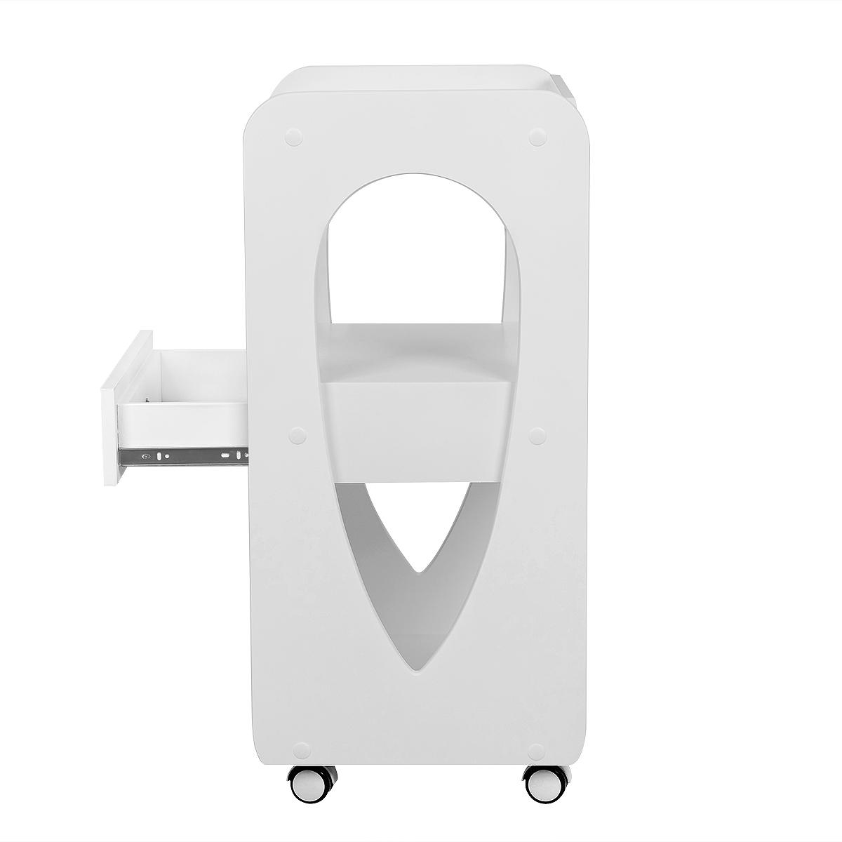 Элегантный оригинальный дизайн столика косметолога МД-801 сделает его настоящим украшением любого косметологического кабинета или СПА-салона. Конструкция столика не сложная, но продуманная и функциональная. Три открытые полки расположены на разных уровнях, где мастер может удобно расположить все необходимое оборудование при проведении косметологических или СПА-процедур. По центру находится небольшой выдвижной ящик с красивой декоративной накладкой и изящной ручкой. В ящике можно хранить расходные материалы и аксессуары, которые не хочется оставлять на виду. Благодаря тому, что высота ящика небольшая, расстояние между полками значительно увеличивается, и на них можно разместить высокие средства для СПА-процедур, или небольшую косметологическую технику. Самая верхняя полка оснащена бортиками с трех сторон, которые защищают от падения расположенные на ней инструменты. В основании столика установлены 4 опорных колеса, что делает его мобильным, а работу мастера комфортнее. Все колеса двойные и съемные. Сам столик выполнен полностью из дерева. Помимо изящно декорированного ящика, боковые стенки украшены отверстиями, это придает столику легкости, делает его дизайн еще более оригинальным. Элегантный и функциональный столик косметолога МД-801 поставляется в двух цветах – белый и кофейный, вы можете выбрать модель, которая подчеркнет и дополнит индивидуальность интерьера вашего косметологического кабинета или СПА-салона.