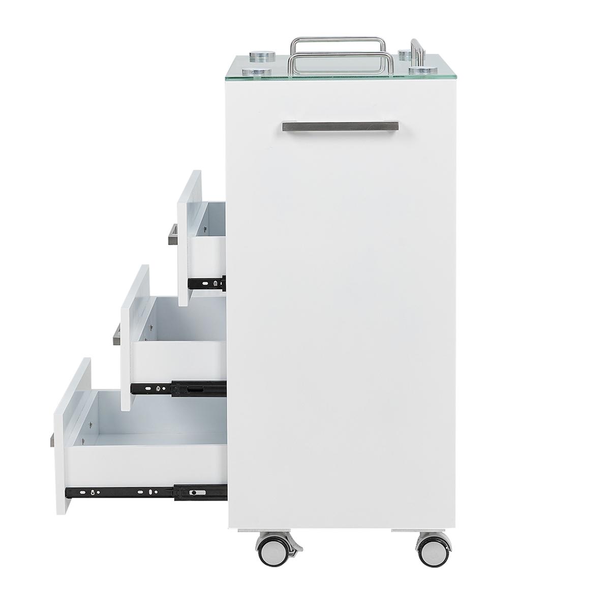 Столик косметолога МД-815 станет незаменимым помощником в организации удобного и одновременно стильного рабочего места. Конструкция столика отличается своей простотой и функциональностью. Вместительная тумба с тремя выдвижными ящиками, где можно хранить все необходимые расходные материалы. В открытой полке мастер может разложить принадлежности, которые часто использует при косметологических или СПА-процедурах. А на стеклянной полке сверху удобно размещать инструменты и средства, которые используются в данный момент. Хромированные бортики служат надежным барьером от случайного падения инструментов на пол. Ручки по бокам тумбы позволяют не только легко перемещать столик, но и разместить на них аксессуары. Простота перемещения косметологического столика МД-815 обеспечивается не только ручками, но и 4мя вращающимся колесами. Все колеса двойные и съемные, а два передних оснащены стопами, благодаря чему столик надежно фиксируется на месте. Преимущества столика косметолога МД-815 делают его незаменимой частью косметологического кабинета или СПА-салона: качественные материалы и продуманная конструкция обеспечит комфорт при работе мастера, классический белый цвет гармонично впишется в любой интерьер, а компактные размеры позволят оптимально использовать пространство даже в небольших помещениях.