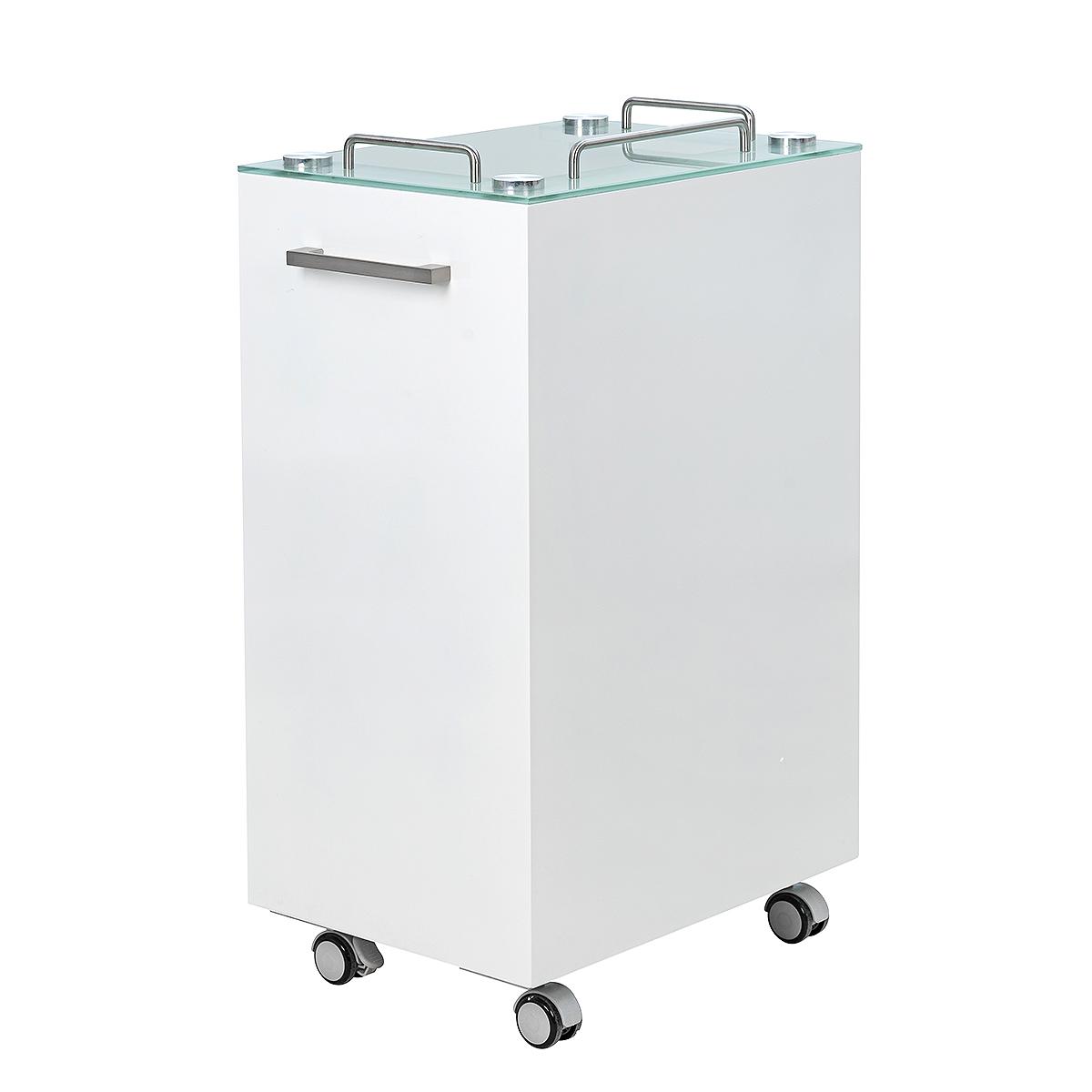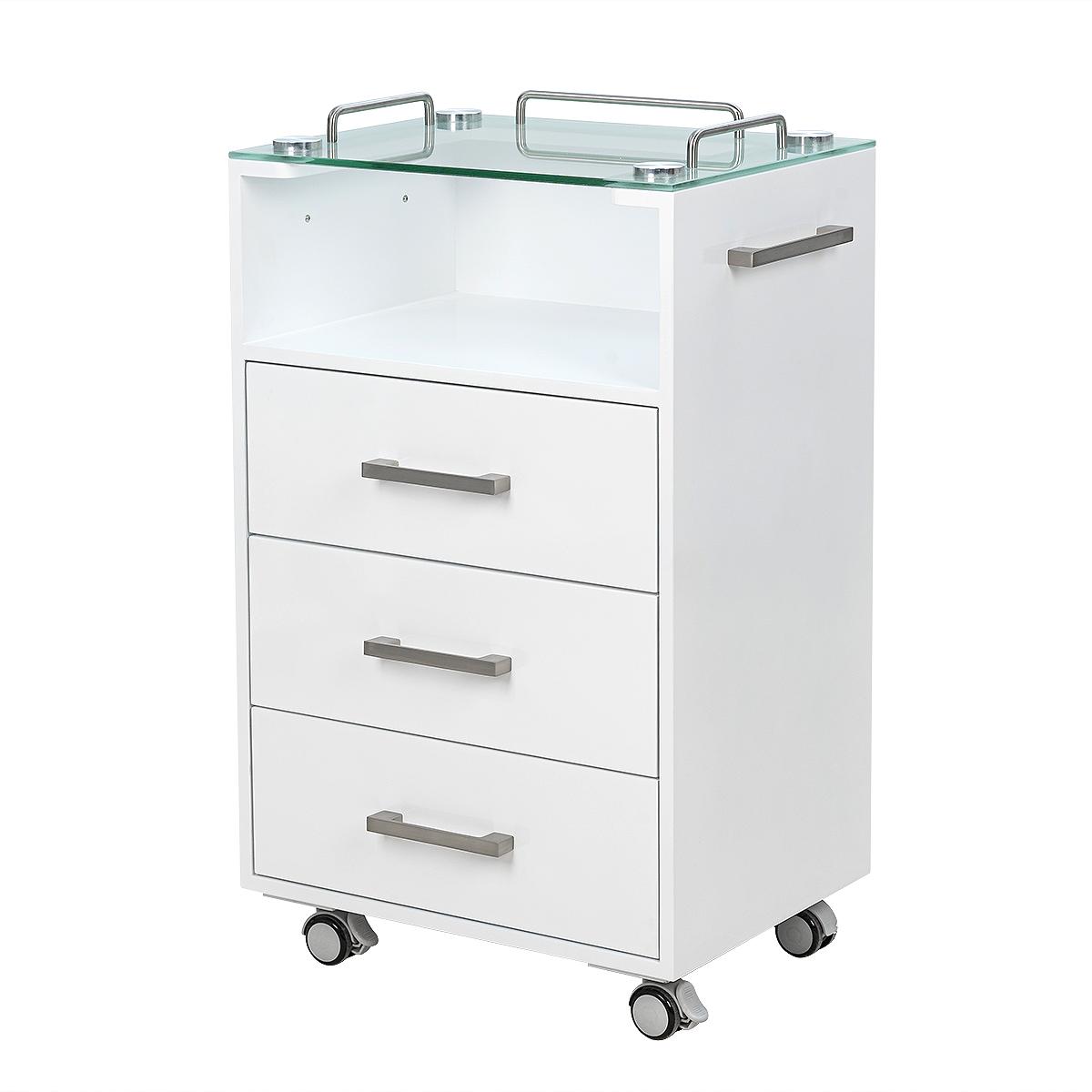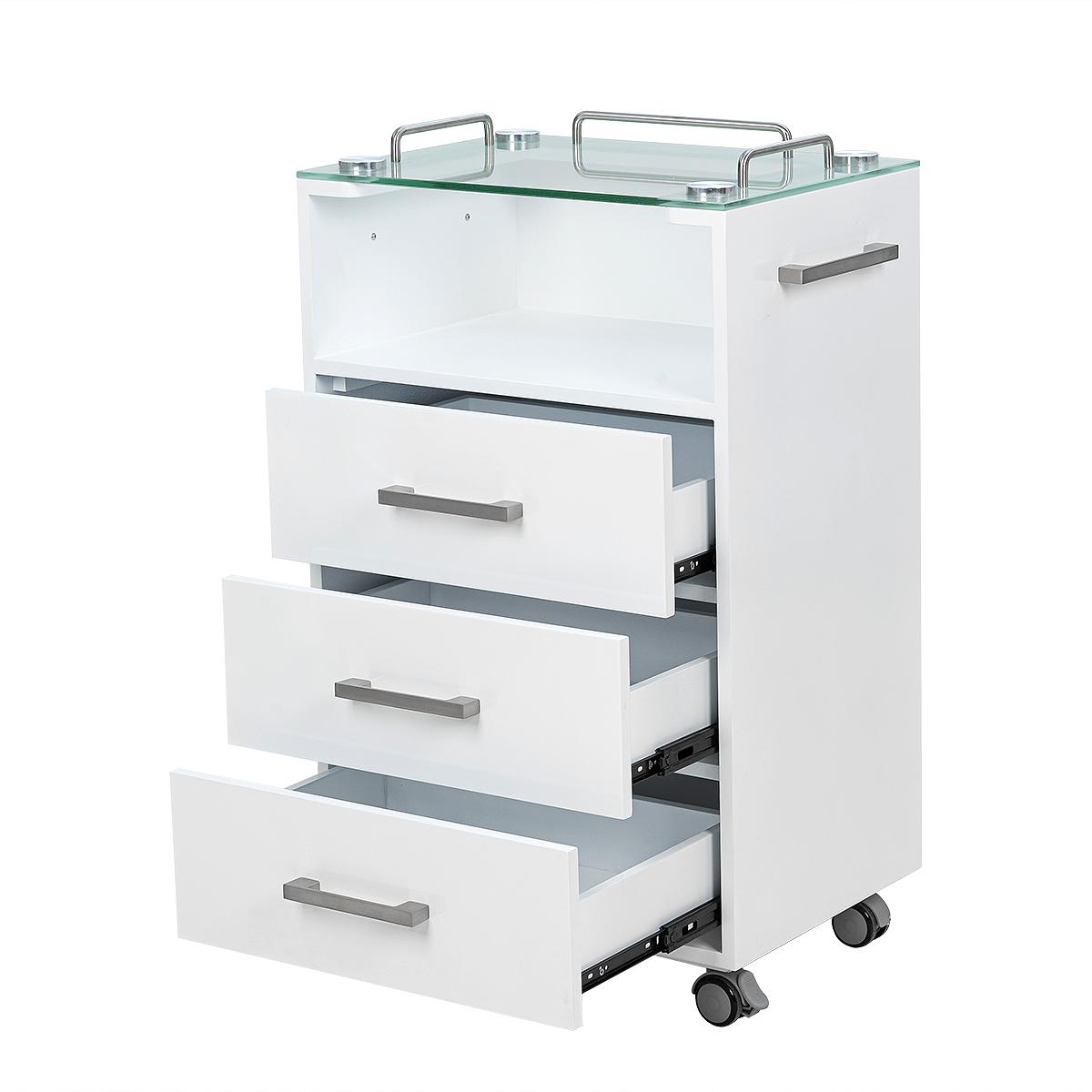 Комплектация: стеклянная верхняя полка с хромированными бортиками, 3 выдвижных ящика и 1 полка, ручки по бокам тумбы, 4 опорных колеса, двойные, съемные, 2 передних со стопами.