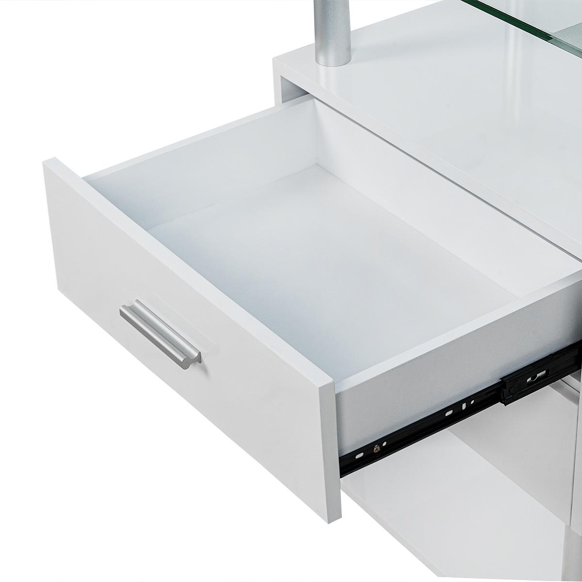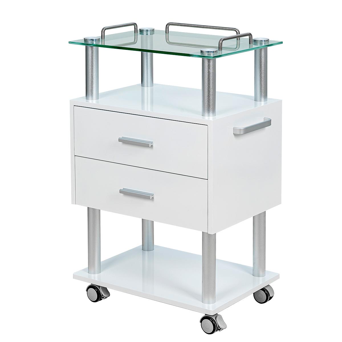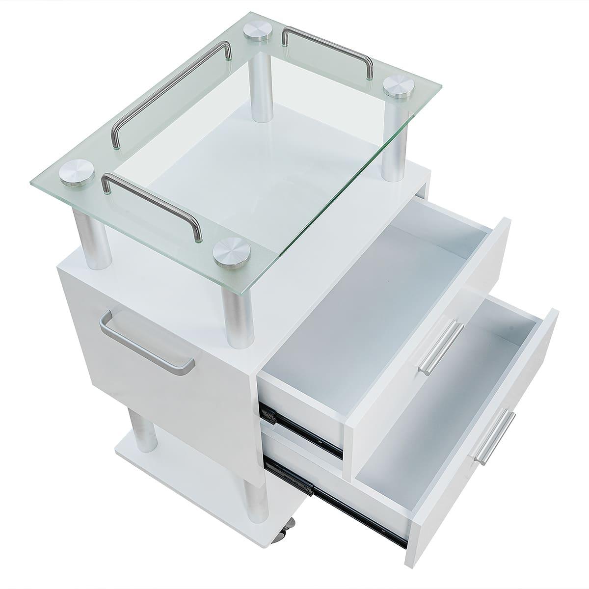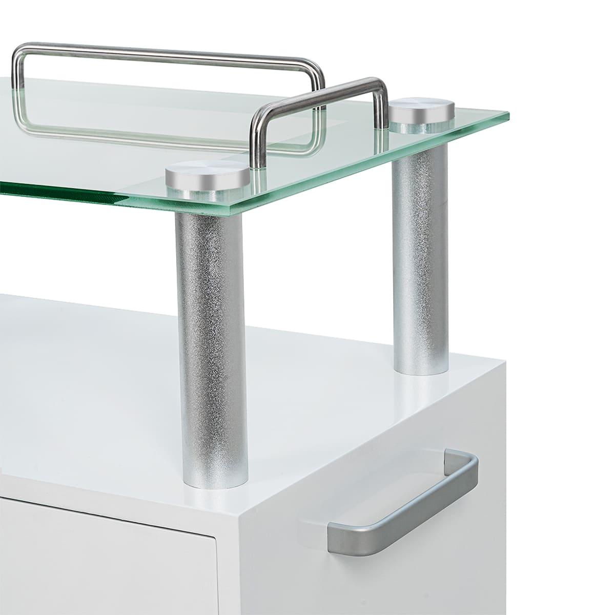 Комплектация: тумбочка состоит из каркаса (хромированные трубы), стеклянной верхней полки, двух открытых полок и двух выдвижных ящиков; верхняя полка с хромированными бортиками; 4 опорных колеса, двойные, съемные, 2 передних со стопами.