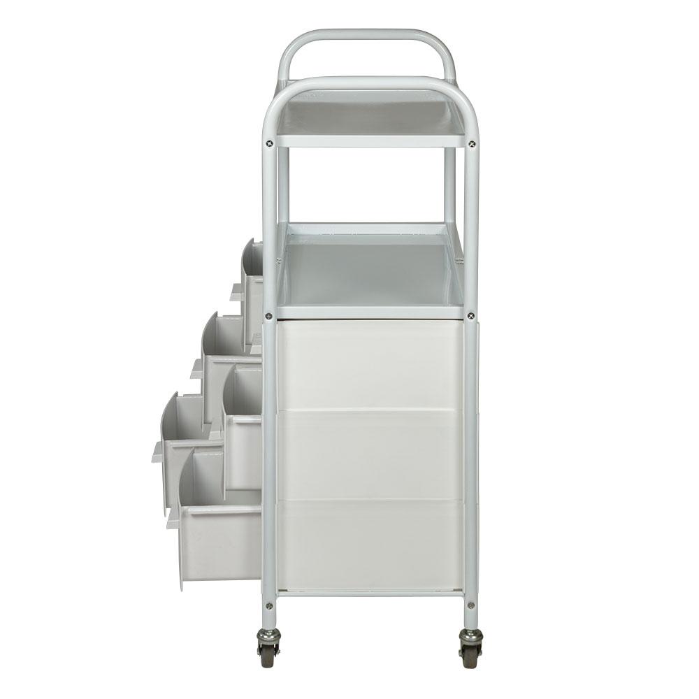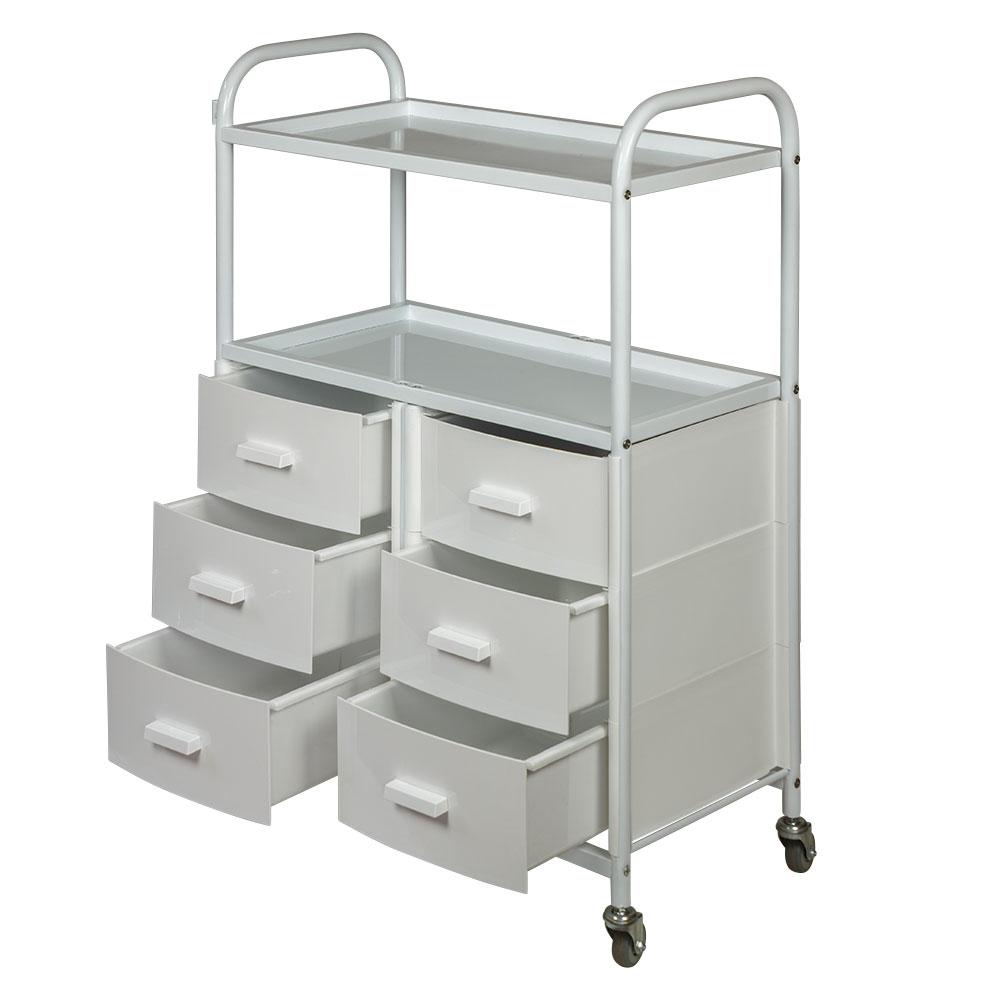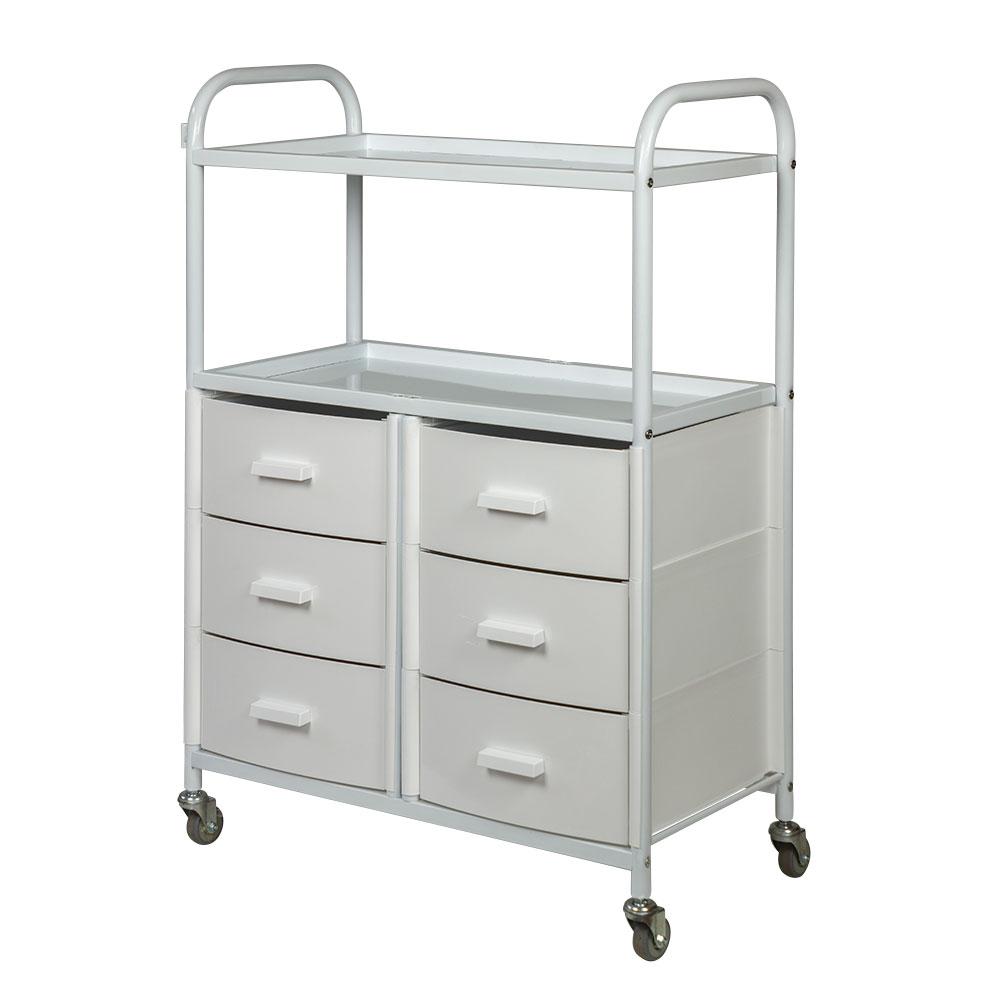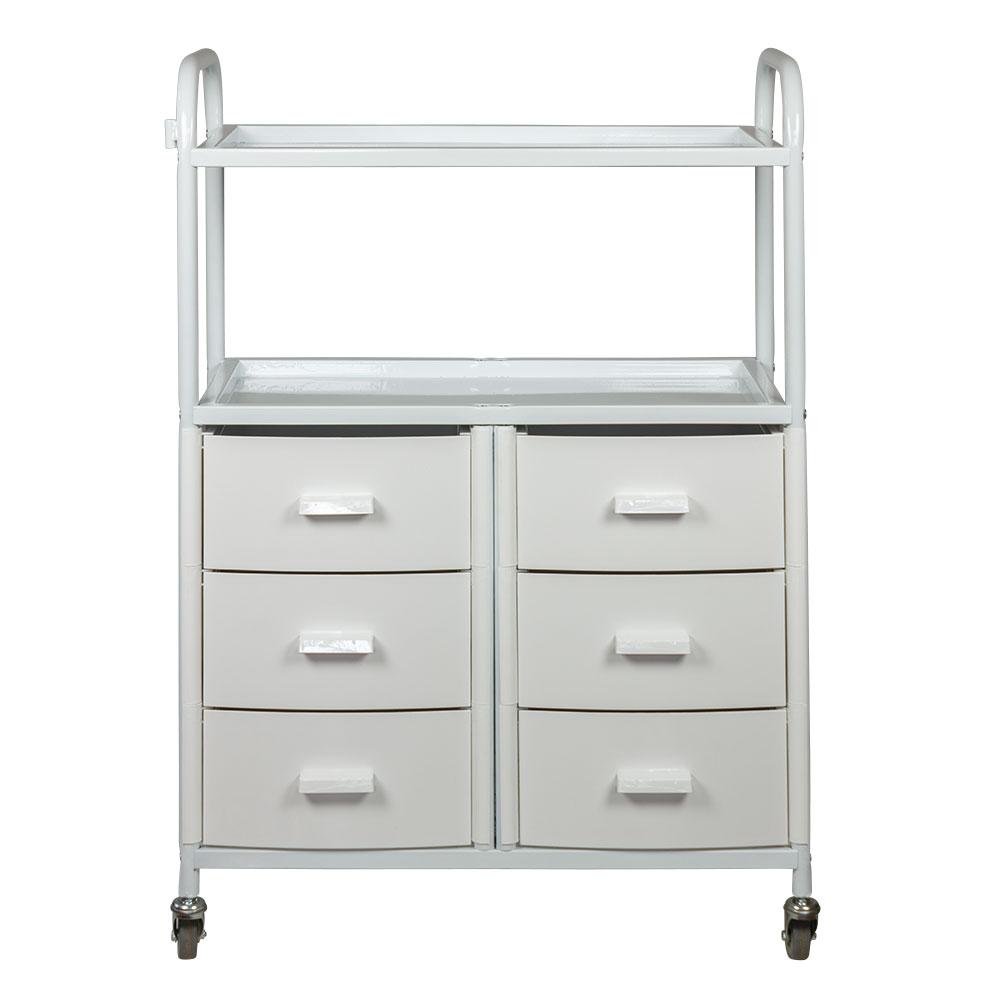 Косметологическая тумба-стеллаж Oliva – упростит работу специалистов и станет стильным дополнением в салоне красоты. Косметологическое оборудование не займет много места и гармонично дополнит интерьер салона красоты. Для инструментов, аксессуаров и расходных материалов достаточно места в шести выдвижных ящиках. Полки можно использовать как для необходимых приспособлений, так и для установки небольших аппаратов. Несомненным плюсом косметологического оборудования являются встроенные маневренные колесики. Мастер без особых усилий может перемещать косметологическую тележку по рабочей зоне. Каркас выполнен из прочного металла, поэтому косметологическая тележка выдержит на себе огромную загруженность инструментами и разными приспособлениями. Боковые панели и ящики изготовлены из ударопрочного пластика. Для полок использованы цельные металлические листы. Для защиты от коррозии и влаги поверхности металла защищены специальной краской. Материал прекрасно переносит чистку моющими и дезинфицирующими средствами. Компактная и вместительная косметологическая тумба-стеллаж Oliva эффективно решит проблему экономии рабочего пространства.