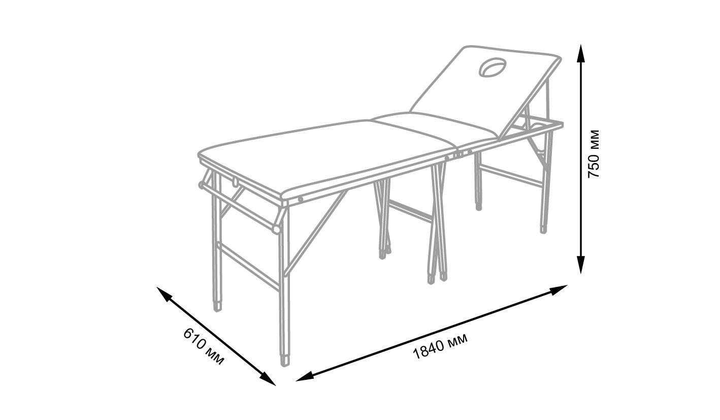 Комплектация: металлический каркас, мягкие детали кушетки, съемная мягкая подушечка, удобная сумка с ручками для транспортировки в сложенном виде.